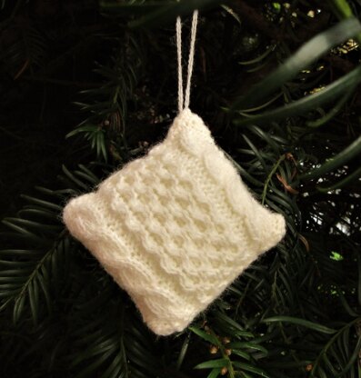 Materials required for each ornament: Any size yarn and needles may be used to make this decoration, but for a 1:6th scale cushion use 2.00 mm knitting needles with approximately 55 yards/50 metres 3-ply/light fingering yarn and for 1:12th scale use 1.00 mm knitting needles with 1-ply yarn; cable needle (if you cannot find a miniature cable needle see here); small amount of polyester stuffing; sewing needle.