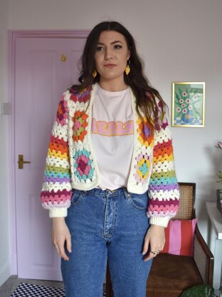 Downloadable pdf- Crochet pattern to create my granny squares and stripes cardigan made with aran weight yarn.
