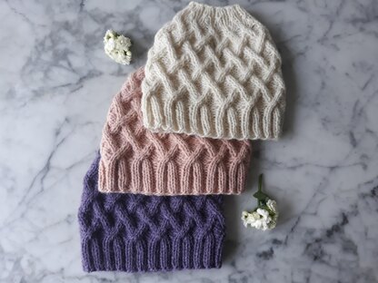 - The hats pictured have been knit in Drops Nepal (purple), Aldi So Crafty (pink) and Yarn Vibes Aran yarn. The hat is suitable for any Aran yarn.