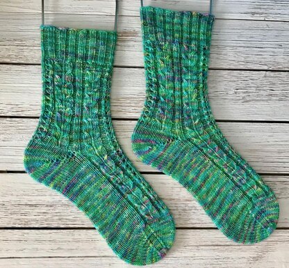The Arcane Socks are a cabled and lace stitch pattern that works with even the most busy variegated yarns and still not fade into the background.