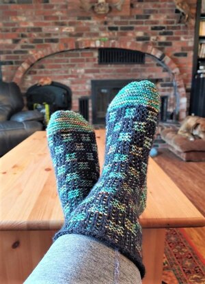The slip stitch pattern of these cozy socks reminded me of warm flannel in winter. The fabric of these socks is very thick and squishy! They are like a worsted weight house or slipper sock, and are very warm. Excellent for fireside lounging, coffee drinking, apres ski, and general cold weather snuggling up! These ones likely won't fit in your shoes!