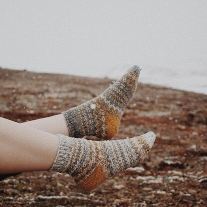They are knitted top-down and in the round, featuring a stranded colourwork motif throughout. The heels are knitted using the afterthought heel technique. It includes sizes for children, teens and adults.