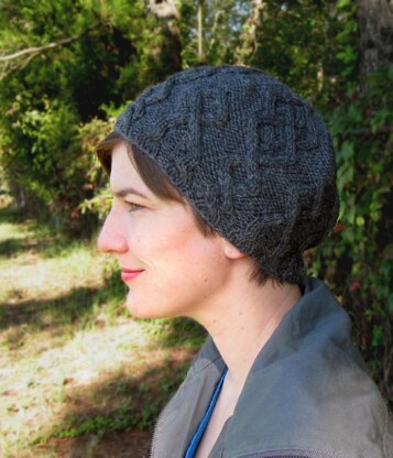 A slouchy beret worked in a cabled argyle pattern on a background of reverse stockinette stitch. Worked in the round from the botton up in a worsted weight yarn, this hat will be a classic staple in your winter wardrobe.