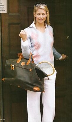 This sweater is knitted flat in stocking stitch, has full length set in sleeves and side shaping reducing width from hip to the bust line. The fine rib neckline is knitted along with the Right and Left Fronts, avoiding picking up stitches for the neck edging. The Back and Sleeves are plain while the Front of the sweater features Argyle motifs which are worked using bobbins combining Fair Isle (stranded) technique for the white stripe and intarsia for the pink diamonds. Separate balls of Main shade yarn are used for the sides and middle. The sizing is for a standard fit of 5cm (2 in) ease at the bust. Check the final measurements and measurement diagrams to decide the size you would like to knit depending on whether you would like this sweater to be loose or neat.