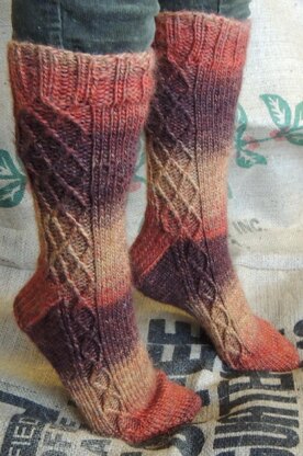 Just perfect winter Boot Socks. Aran or worsted weight, quick knit and snuggly. This charted pattern is a whisper of Argyle with enough fun to avoid the dreaded second sock syndrome!