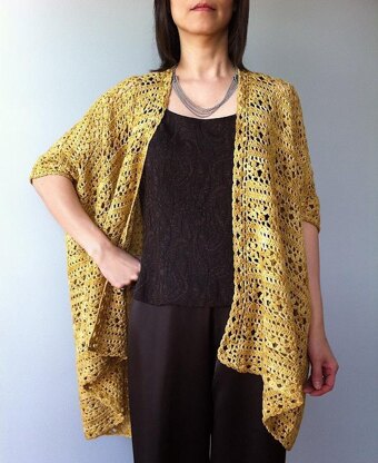 Featuring a lovely floral lace back yoke and matching floral stripes, Arianna with its relaxed silhouette and elbow length sleeves is effortlessly stylish and easy to throw on. The unique yet simple construction allows the fronts to drape and cascade beautifully into a chic high-low hem. Arianna can also be worn “upside down” with extra fabric around the neck for extra warmth and coziness. Seamless and worked in one piece from top down, the cardigan can be easily customized in cuff circumference, and body width and length. For a twinset look, pair it with the matching Arianne top (sold separately).