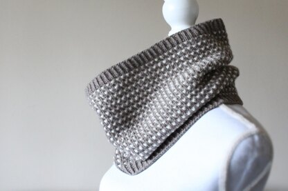 Arrochar is a textured two-colour cowl worked in the round using DK/8 ply yarn. It is a straightforward knit that uses only one colour per row in a simple slipped-stitch mosaic pattern and incorporates neat twisted rib edges at the top and bottom.
