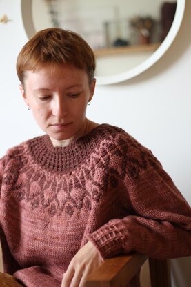 The pullover is knit top-down in the round with a textured top of the yoke and cuffs and simple inlay colourwork pattern around the yoke. Both, the bottom of the body and cuffs, are finished with folded hem edges. It is a quick and easy knit suitable even for adventurous beginners.