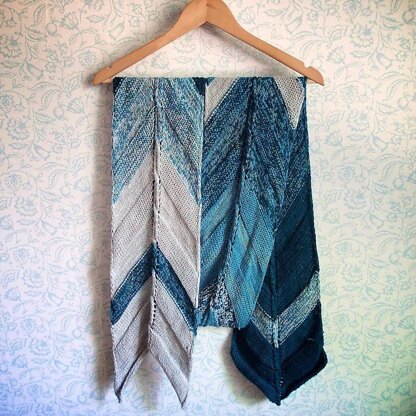 Arrowrap is freely inspired by traditional Métis sashes which are still a symbol of Quebec's culture. It's a long and large wrap in the shape of an arrow, made out of 3 colors of the same yarn, held double and resulting in a gradient. Each color section is broken by a large line of the opposite colors. Each section is made in knit and purl stitches and the middle stitches are a reversible cable. The whole wrap is perfectly reversible.