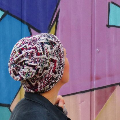 This slightly slouchy hat is worked in the round from the bottom up, starting from the brim worked in striped garter stitch with yarn held double. The rest of the hat is worked using the marlisle technique with a dynamic pattern showing two direction arrows.