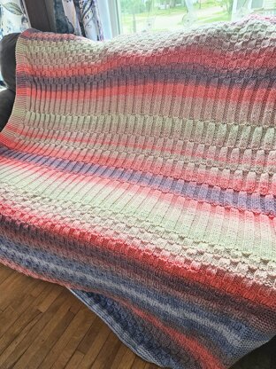 For a finished blanket that's approximately 60x72.5" (with LOTS of stretch, flexibility, and drape), you'll need approximately 2400 yards of a worsted weight yarn in the fiber of your choice. Featured yarn is Caron Ombre in colorways 'Blossom' and 'Blush and Blue.' You'll need a US-9 circular needle of 40" or longer, and also a tapestry needle and scissors.