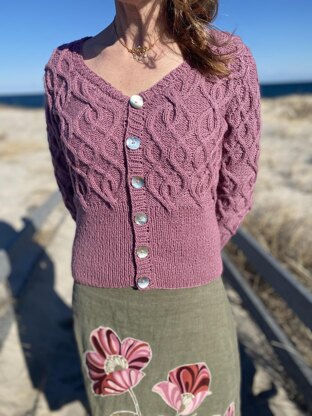 This is a lovely cardigan featuring a new cable that is reminiscent of patterns featured in Art Nouveau design. The yarn is a cotton/merino blend and is light, but warm, perfect for chilly spring nights. The cable is charted. The model in the pictures in 5’ 9” and a size four, and is wearing a small. The pattern is written so that the length of the sweater is easily adapted to fit all heights. The sweater features positive ease, and is a bit roomy, so if you prefer your sweaters more snug I recommend going down a size.