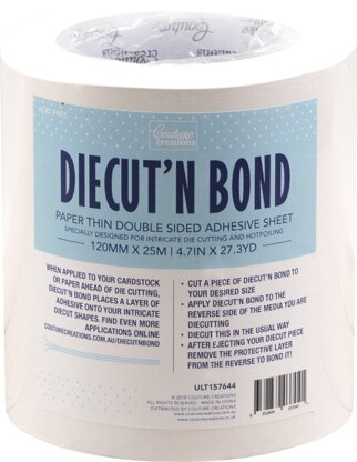 Diecut'N Bond is a wide roll of double-sided adhesive tape. It's paper thin and easy to use. Apply to paper or cardstock before die- cutting a shape. Once cut, peel off protective backing and place shape on a project where desired. Great for adhering intricate dies. This package contains 82 feet of 4.75 inch wide double-sided tape. Acid free. Imported.