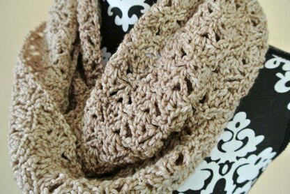 This beautiful double wrap infinity scarf is crocheted using the Crow's Foot Lattice Stitch, creating a distinctive openwork lace pattern with a moderate drape. Madelintetosh Tosh DK gives the scarf enough warmth to be a perfect accessory on a cool spring or fall day. The stitch pattern is easy to acquire, and the scarf crochets up in a flash. You'll be wearing it in no time or giving it as a gift to that special person!
