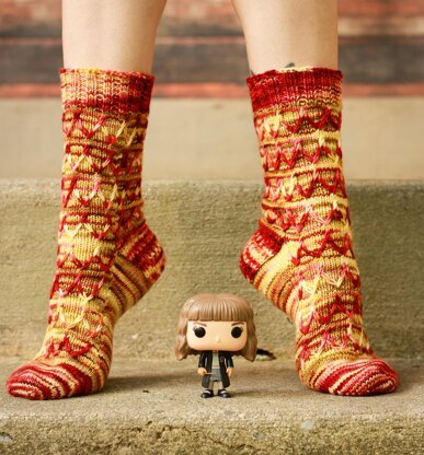 Better be . . . Gryffindor! After spending many years trying not to get swept up into Harry Potter mania, once I finally read the books, I was hooked. I love to get lost in the magical world J. K. Rowling created. So when I saw the opportunity to design an HP-themed accessory, I jumped right in! The Ascendio socks, worked from the toe up, use 2 complementary colors and slipped stitches to create an allover stair step design inspired by Hogwarts’ magical, moving staircases. As the 2 colors blend together in spots, the steps seem to disappear and reappear. Knit them in your house colors and wear them out on the Quidditch pitch or just to lounge around the common room—100% Hermione approved!Note: stitch pattern is charted only
