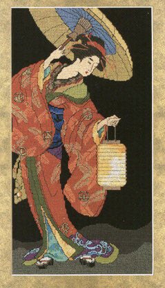 Designed by: Nancy Rossi. This dramatic wood block style design by Nancy Rossi will live in harmony in any Asian dГ©cor. The elegant Asian Woman leans in to her glowing lantern to light her way against a black background.\n