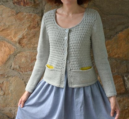 This cardigan is worked from the bottom-up, in one piece to the armholes, and then fronts and back are worked separately. The sleeves are worked in the round from the bottom-up. The shoulders are seamed and the sleeves are sewn to the armholes. The inset pockets are knit in as the body is worked.