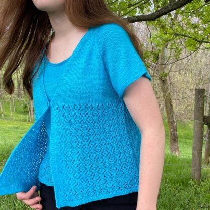 Asterion Cardigan is a top-down, lightweight raglan sleeve cardigan with an easily memorized lace skirt. Short sleeve or long sleeve option included. It’s easily customized to exactly your size – just try it on as you go, and stop increasing when it fits!