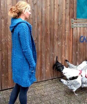 Astrid is a cardigan which is knitted top-down and features easy cables and a raglan yoke. Begin at the neckline and work the raglan yoke, separate sleeve stitches at the underarm and work the body with pockets. After that, knit both sleeves and pick up stitches to work the hood to the top. At last, pick up stitches around the body and the hood to create the buttonband with ribbing. Finish the cardigan with knitting the pockets.