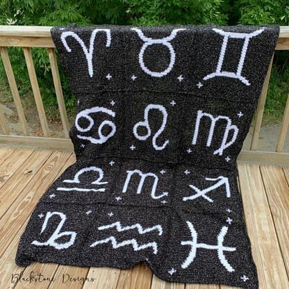 The Astrology Afghan is made up of 12 - 16” x 16” (41 x 41cm) squares, all featuring one of the 12 zodiac glyphs.