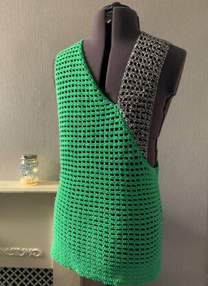 This crochet pattern is for a men’s tank top with a difference. The top features a diagonal front and extended shoulder so the join sits over the pecs, with one arm hole high and one armhole low. This would be perfect for someone with a shoulder tattoo or anyone who likes a bit of drama in their clothing.