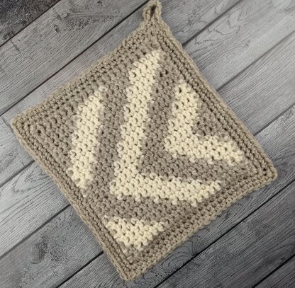 The Asymmetric Arrows Set includes charts and written instructions for a wall hanging, mug rugs, and a hot pad! With one ball each of Simply Wool Bulky in colors Wanda and Winkle, I was able to make the wall hanging, 1 mug rug, and 1 hot pad. To make a set of mug rugs or hot pads, you may need to purchase additional yarn.