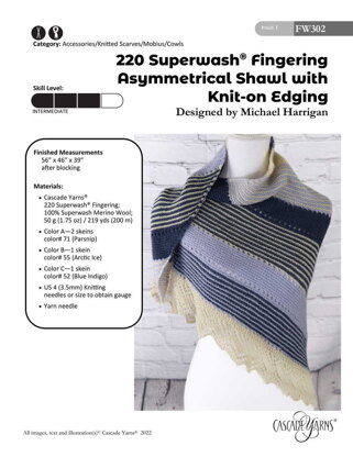 Asymmetrical Shawl with Knit-on Edging in Cascade Yarns 220 Superwash Fingering - FW302 - Downloadable PDF is a free Intermediate Knitting pattern by Michael Harrigan, available as a Downloadable PDF and includes instructions in English. Super fun to make, this pattern could be your next masterpiece!