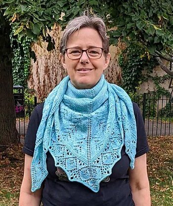 A triangular shawl knitted top down in one piece. Cast on is at the centre of the back of the neck. The body of the shawl consists of garter stitch with a narrow garter stitch edge along the top edge of the shawl throughout. There is an undulating lace border, which is followed by a leaf lace edging. The edging features large triple yarn overs which can be blocked to form a scalloped edge.
