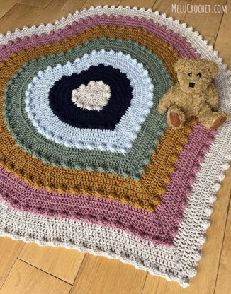 This unique heart-shaped blanket is created in beautiful soft and cuddly Kind Feather yarn and it’s crocheted into concentric bobbly hearts.