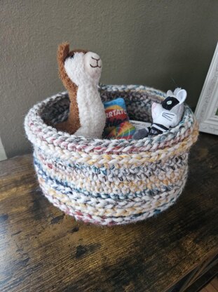 The combination of the super bulky yarn and hook size ensure the basket is sturdy enough to stand on its own. Yet it will still have a bit of give so you can stuff it full with all the fun toys for your pet.