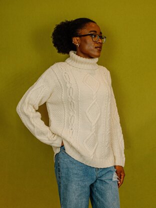 The oversize all over cable pullover features a high roll neck, split hem with a slightly longer back hemline, and some minimal armhole shaping to prevent excess fabric under the arms, for a truly comfortable fit. With cable patterns worked on a reverse stocking stitch background, Autumn Breeze is worked in pieces from the hem and cuffs up and seamed after completion. The neckband is picked up and worked in the round. The stitch patterns can all be worked from charts or from written instructions to suit your preference.