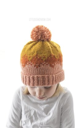 This pretty Autumn Fade Hat Knitting pattern has a gorgeous colorwork pattern that fades from dusty pink to rust to mustard, it's perfect for your baby or toddler this Fall! The folded brim makes it extra cozy, the colorwork is easy to knit and it's topped off with a fluffy pink pom pom, perfection!