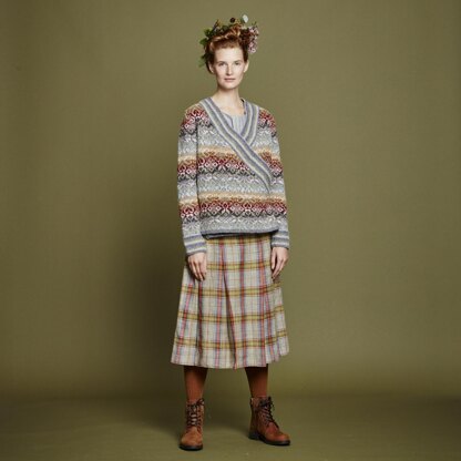 AUTUMN is a lovely kimono fairisle wrap, knitted in Rowan Felted Tweed with a wide moss stitch stripe edging.