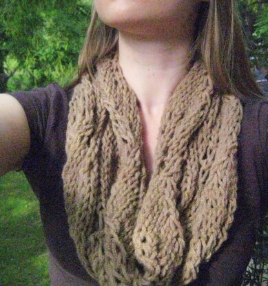From the pattern: "When the crisp days of autumn arrive, who doesn't love a nice squishy cowl to keep warm in? And how much more lovely when the cowl is not only delightful to the touch, but beautiful enough to wear with any outfit whether dressy or casual. The Autumn Leaves cowl uses a simple yet elegant lacy pattern to show off an exquisite yarn, and is a perfect length for wearing looped once or doubled around the neck for extra warmth. The cowl knits up in just a few hours, and can be knit with any worsted-weight yarn with a good bit of stretch."