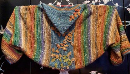 A pretty little shrug in warm autumn colors adorned with a coordinating long crocheted vine appliqué of leaves at the center back, with a shorter matching sprig on the hood. The pattern size is completely customizable to your measurements and I provide easy directions for making it your own.