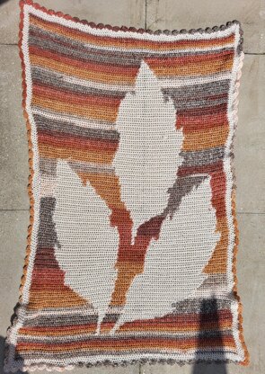 This lapblanket uses autumn leaves and colours as its inspiration. Made using King Cole yarns, it works up quickly, and because it has graph and written instructions is the perfect introduction for someone who wants to learn to crochet from graphs. Using a self striping wool for the background really makes the leaves 'pop'