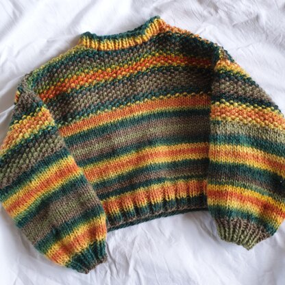A chunky sweater with cropped body and 3/4 length sleeves, easily adjustable for a longer body/ full length sleeves.
