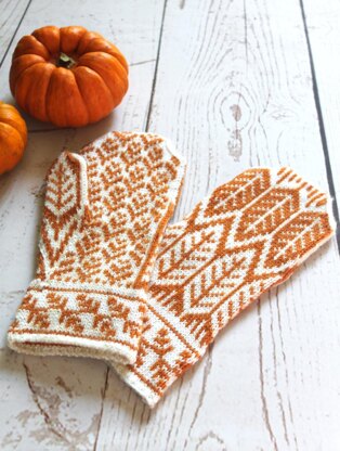 Autumnity are stranded colourwork mittens featuring an abundance of autumn foliage. The pattern includes two sizes and two hand lengths plus a schematic of all measurements.