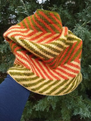 Autumn's Draft Cowl is inspired by the fall, the colors of the leaves, and how the wind blows them in all directions.