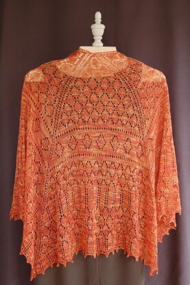 This shawl can be made in two version(scroll down to see photos of other version). The first version is a half hexagon shape made in Schaefer Trenna (available only at Little Knits). The second version is a triangular shape made in Malabrigo lace weight (also available from Little Knits). This pattern is like getting 2 patterns for the price of one. It uses mostly charts, so if you are not a knitter who uses charts, be aware of this fact. The Triangular version is made using Malabrigo lace weight yarn, 2 hanks. It has a different gauge (in Stockinette Stitch, 24 sts and 32 rows = 4") and needle size (size 6), too. It is what I consider an easy lace pattern to follow. The wrong side row is a simple–K2, purl across to last 2 sts, K2. I try to always have a breather row in my lace patterns, to me it makes lace knitting more enjoyable. **ERRATA--**There are 2 places where I left out YO's. One is on Row 57 after Chart B. The last YO before the last K2 was left out. It should sa