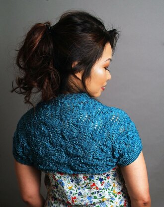 Indulge yourself in a luxurious silk and merino yarn to make this small, portable shrug. It is ideal for rolling up in a bag to pop out when summer evenings turn chilly, or just for adding a little hint of colour to finish off an outfit.