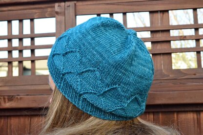 This hat has cables/travelling stitches to give it the delicate archways that create the design.