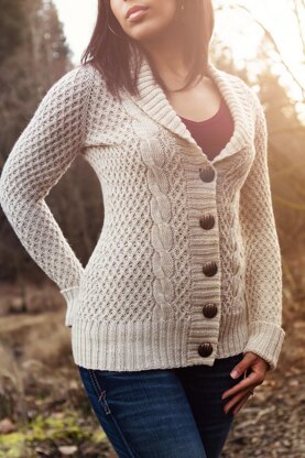 Avalyn is a timeless, elegant piece with classic design details and modern, feminine shaping. The rib‑based, allover lattice texture and chunky cables together with the cardigan’s folded cuffs and shawl collar will keep you warm and cozy in sophisticated style.