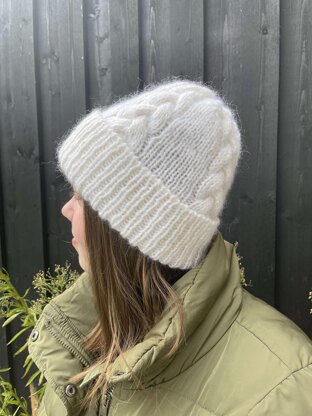 The Aviaja hat is a one-size, feminine, cable-knitted hat. First, you will cast on stitches with an Italian cast-on, and then work in ribbing. The ribbing is later folded in half to create a neat edge. The work is then divided into cable sections, which consist of stockinette cables and braids. Lastly, decreases are worked at the top of the hat.