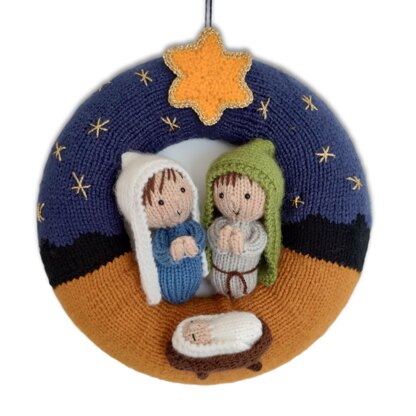 If you don’t have the time or the space to display the full cast of a Nativity play, this knitted wreath of the Joseph, Mary and Jesus characters could be your ideal handmade decoration this festive season. The wreath itself is a 25cm polystyrene wreath form covered with a knitted strip, and uses a provisional cast on and Kitchener stitch grafting. The pattern also incorporates a little stranded colour-work. Designed by Amanda Berry @fluffandfuzz, the wreath is knitted in acrylic DK yarns on single pointed needles (not in the round). For intermediate knitters and above, other techniques used include casting on and off, knits, purls, increases and decreases, seaming and a little embroidery to finish. The large star has a single crochet border worked on the crochet hook.