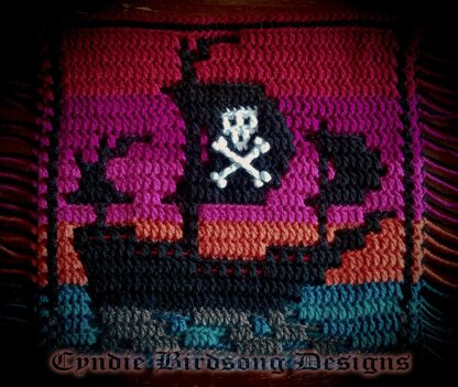 This is a great way to use up scraps! To do the sample image, you will need 4 colors for the sunset (approx .2 oz each), 1-2 colors for the water (.2 oz total), black for the ship (.75 oz), and scraps of white, ALL in worsted or aran (wt 4) type of yarn. You can use other weight yarns if desired, just be sure to use the recommend hook size.