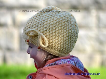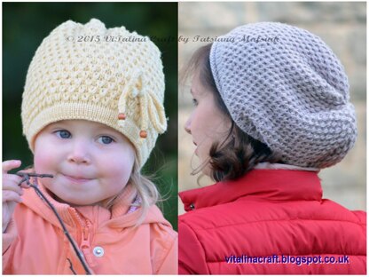 This hat is perfect for cool autumn days. Axelle hat is stylish and comfy to wear and fancy knitting. It is knitted with two stand of yarn to create three-dimensional texture. The brim of hat is knitted in the round and the body of the hat is knitted back and forth. The pattern is written for two depth of hat with two brim types – beanie with simple brim in stockinette (yellow hat) and slouchy with rolled edge and ribbing pattern (grey one). Hat in yellow is decorated with I-cord bow and wooden beads.