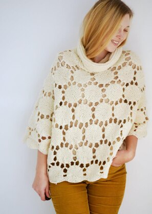 Aystra is a poncho-like sweater with a generous collar and short dropped sleeves. It is made with motifs worked in the Tunisian crochet technique.