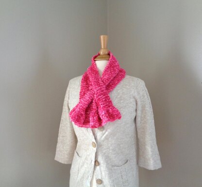 A flirty keyhole scarf in the brightest pink yarn, with ruffled ends that remind me of full azalea blooms!