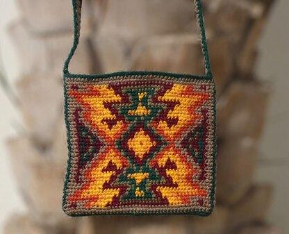 A bold and colourful crochet bag, inspired by the Aztecs, make this square bag an attention grabber!